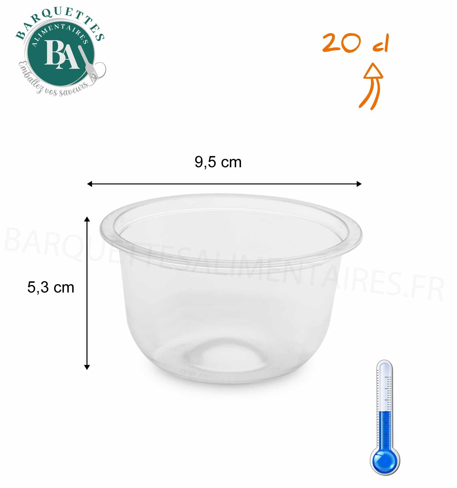 Fabriqué en plastique APET, il est très résistant face aux chocs possibles.Sa contenance de 200 ml et son diamètre de 9.5 cm, permet de conditionner des desserts individuels, panna cotta, crème, mousse, etc.