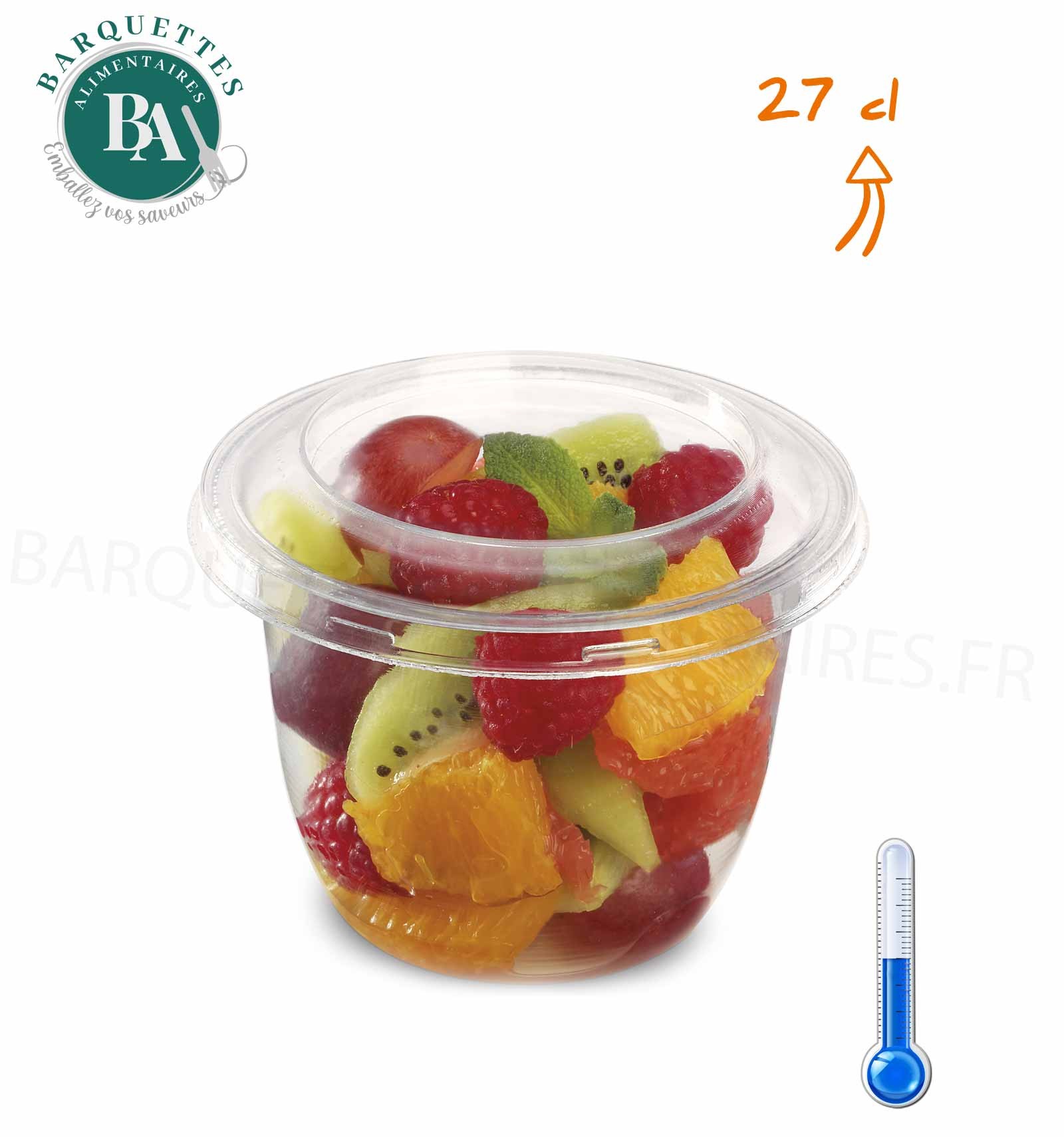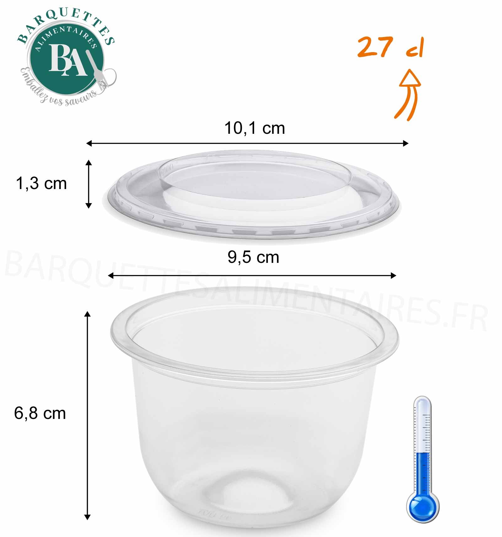 Fabriqué en plastique APET, il est très résistant face aux chocs possibles.Sa contenance de 270 ml et son diamètre de 9.5 cm, permet de conditionner des desserts individuels, panna cotta, crème, mousse, etc.