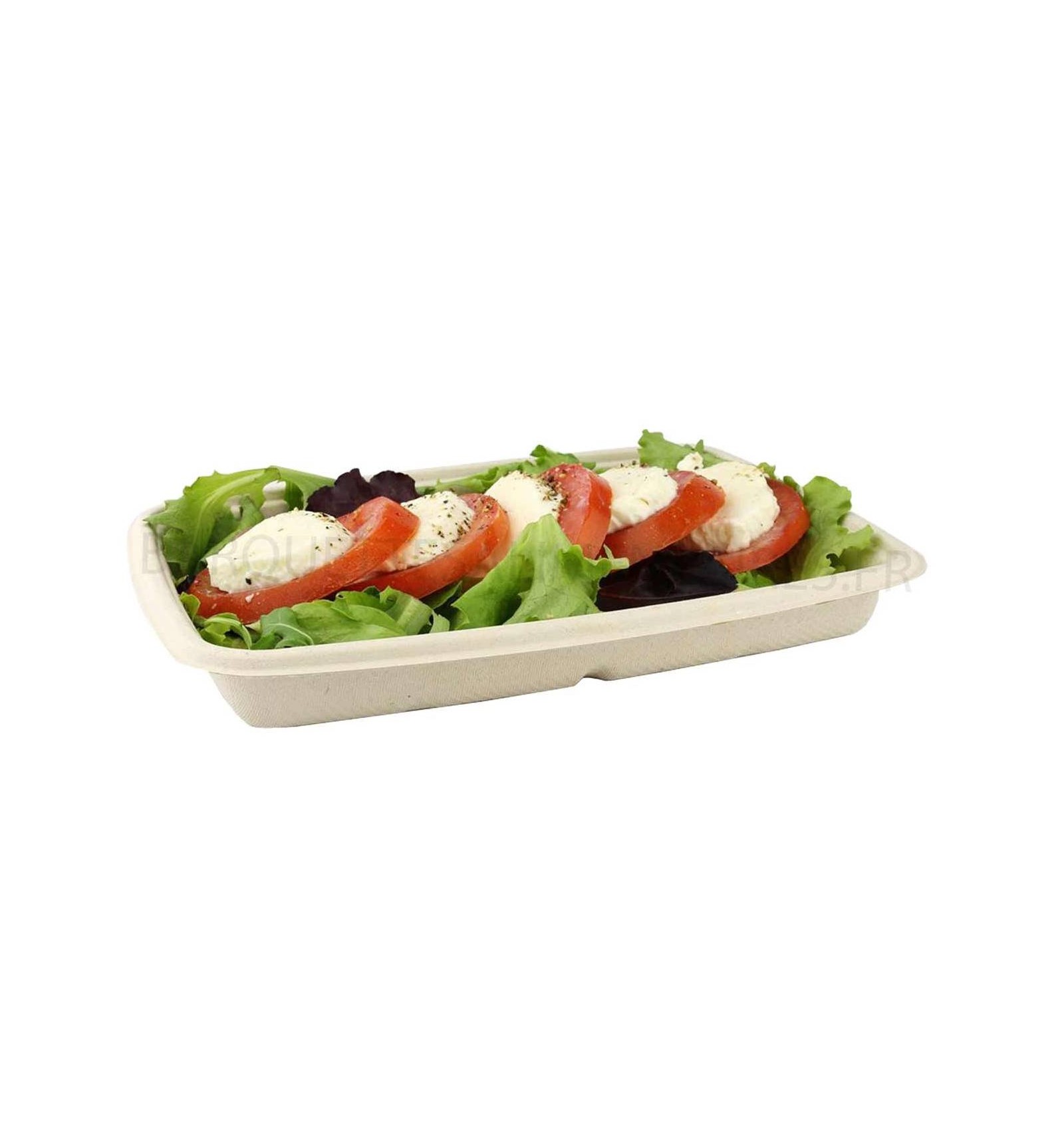 Cette barquette 100% biodégradable est fabriquée avec de la fibre de canne à sucre, elle est imperméable aux graisse et totalement étanche.